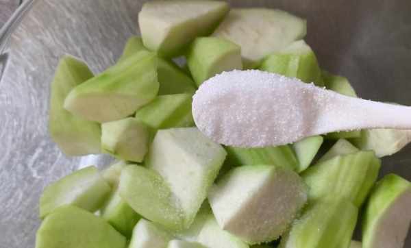 切好後放進碗內,再撒一小勺食鹽,拿起碗抖動幾下,或者用手輕輕抓拌幾下,讓鹽附著在絲瓜表面,醃制幾分鐘。