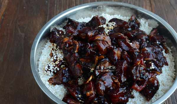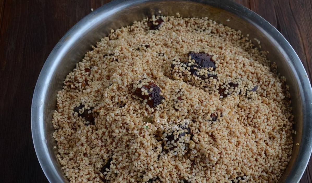 糯米泡夠時間後,撈出瀝幹水分,加入3勺生抽、2勺老抽、2勺耗油和醃制過的鮮肉一起拌勻;