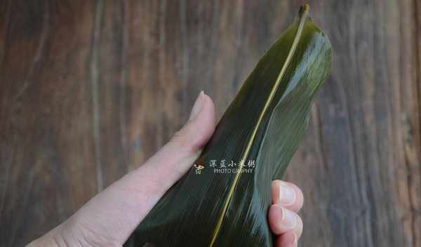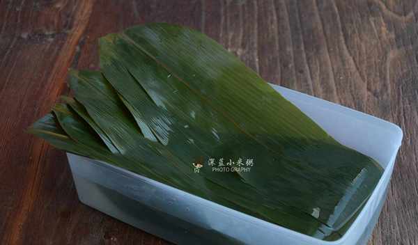 選用7~10厘米寬的粽葉,先把粽葉根部放在開水鍋內煮3~5分鐘,使其回軟,再把整個粽葉放入開水鍋裡煮10分鐘左右,使其完全回軟。煮好的粽葉兩面用刷子清洗幹凈,之後將洗好的粽葉泡在清水中備用;