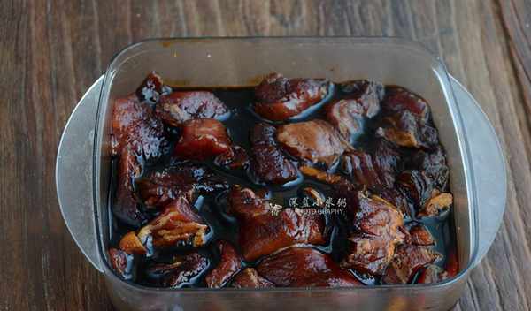 300克的鮮肉用3勺生抽醬油、2勺老抽、2勺耗油、1勺白糖和3片生薑一起抓拌均勻,蓋上蓋子,放在冰箱裡冷藏醃制8小時以上;