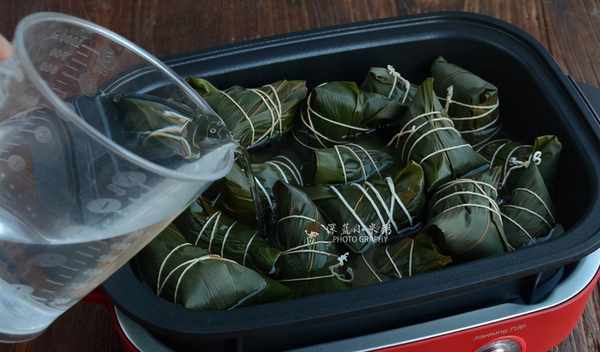 將粽子放入電火鍋中,碼放好,加入適量的清水,煮粽子的水要沒過粽子;