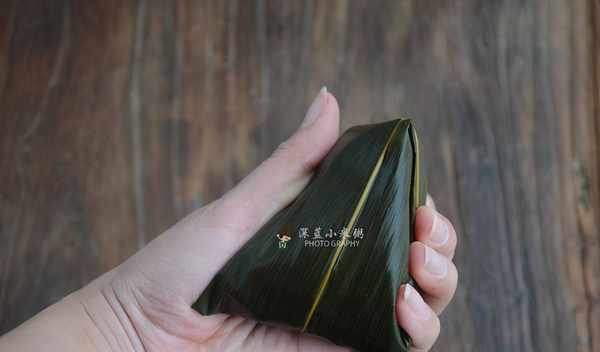 把另一端的粽葉蓋過來壓緊,粽葉兩邊一定不能留縫;