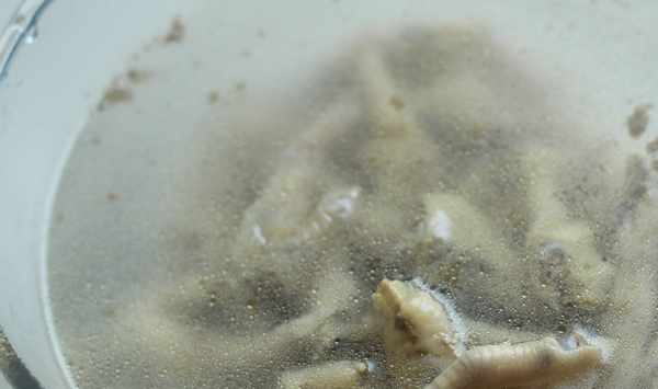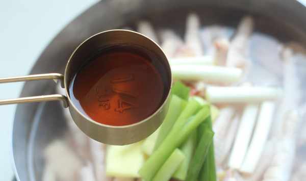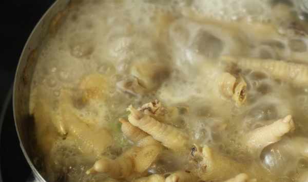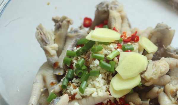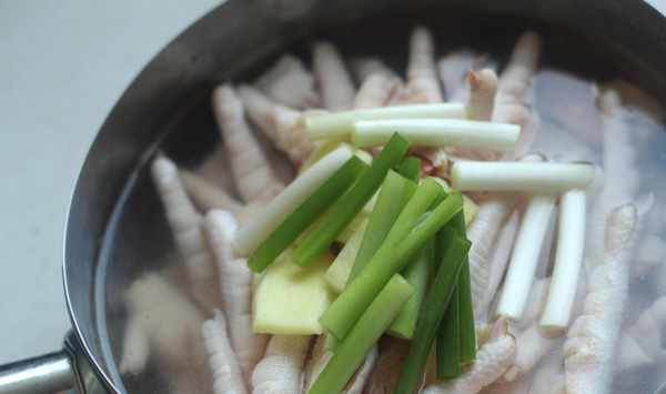 :雞爪放入鍋裡,加薑片、蔥段、料酒煮15分鐘;