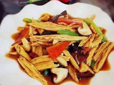 2.在熱鍋中加熱油。油熱後,爆香洋蔥和薑,加入香菇炒香,加入腐竹和紅蘿卜炒勻,倒入適量蠔油、老抽和鹽,攪拌均勻;