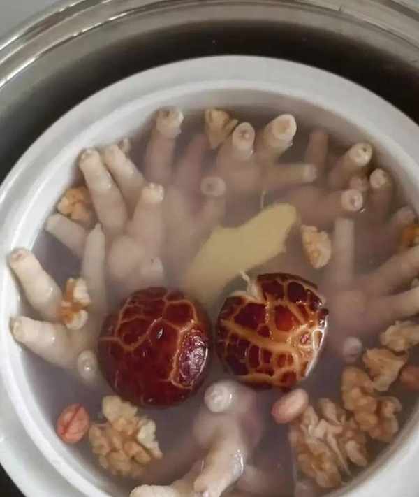 4、將雞腳、香菇、花生、核桃、生薑片放入砂鍋中,加入食鹽調味,小火慢燉2個小時。
