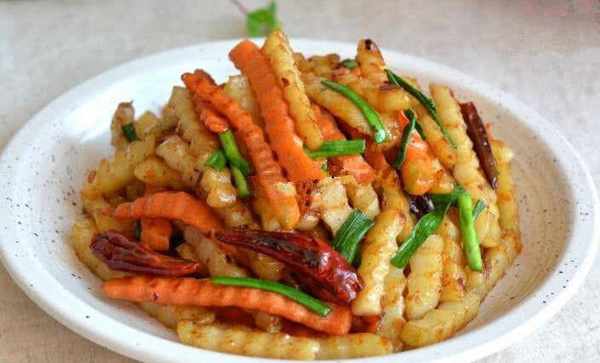 1.先將土豆洗凈去皮,然後切條