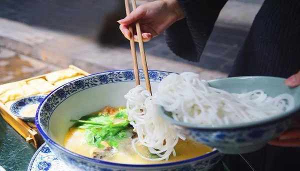關於過橋米線的由來,與一個秀才娘子有關。相傳,清朝滇南蒙自市城外有一湖心小島,一個秀才到島上讀書,秀才的娘子常常弄瞭他愛吃的米線,但等到島上時,米線已經涼瞭。後來,秀才娘子偶然間發現雞湯上覆蓋著雞油可以讓湯保持溫度,吃時再放佐料和米線,口感更好。
