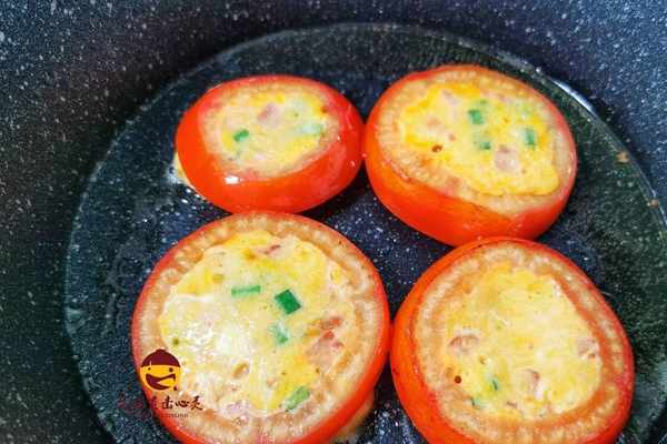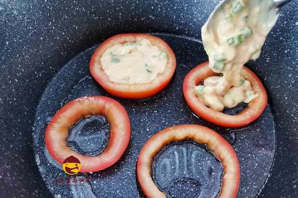 第五步:平底鍋清洗幹凈,擦幹水分,倒入適量的食用油,放入番茄圈,然後用勺子將已拌好的番茄面粉糊放入番茄圈中。