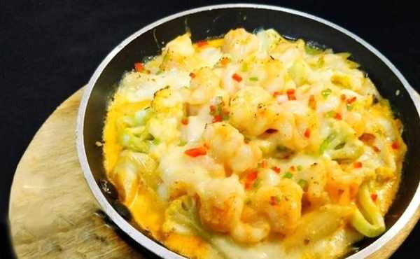 明蝦10頭、空心粉100克、有機菜花100克、洋蔥粒20克、培根10克、芝士、卡夫芝士粉、自制咖喱膽30克、椰漿300克、淡奶200克、奶油50克、雞汁15克、糖、鹽、黃油