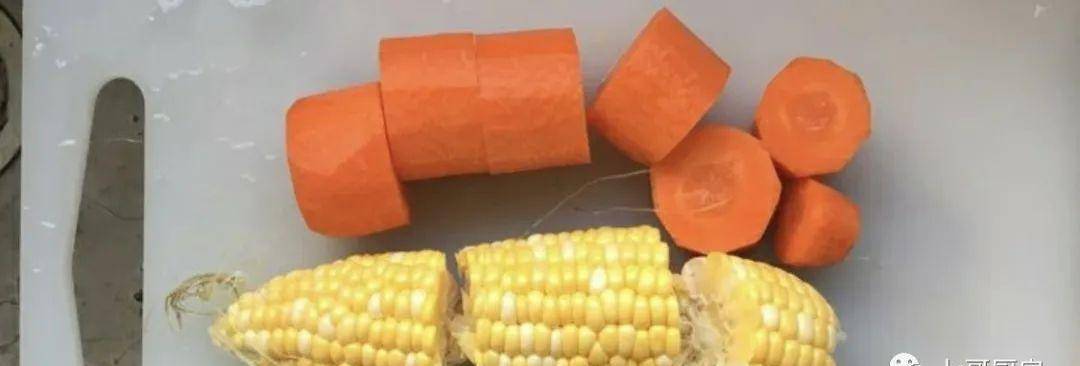 1.準備一根胡蘿卜,一根玉米,洗幹凈切成小塊備用。