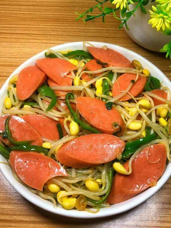 黃豆芽100克、火腿腸一個、蔥適量、宴友食用油適量、鹽適量、花椒粉適量、醬油適量、味精適量