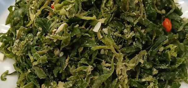 5、時間到,倒入盆裡,把料汁澆到菜裡面。看一下野菜個個分明,不粘連,特別香,裝盤即可上桌。