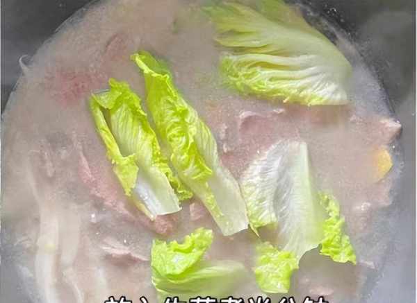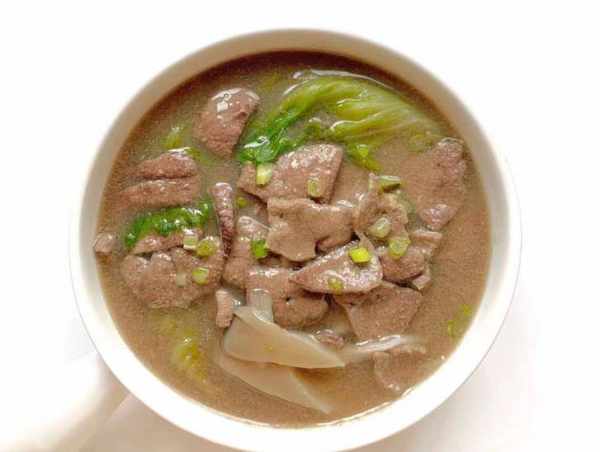 6:轉中小火繼續煮,然後放入醃制好的豬肝片,大概煮3分鐘左右,最後放入一些生菜,將生菜燙至變軟。