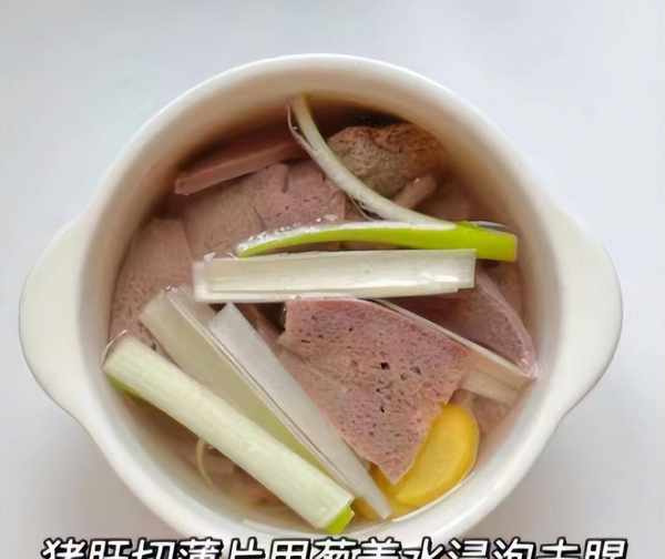2:將豬肝用清水洗凈,豬肝要逆著紋路切片,豬肝片用冷水沖洗掉血水,豬肝片放在容器裡,加上少吃蔥薑水,浸泡半個小時左右。