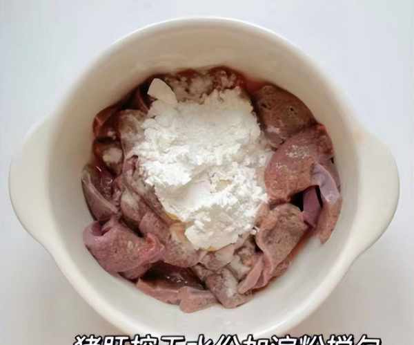 3:豬肝片控幹掉水分,豬肝片放在碗中,加上料酒半勺,加上少許食鹽,加上半勺胡椒粉,調入適量原味生抽,最後裹上生粉或淀粉,用手反復抓一會兒,讓豬肝片醃制入味。