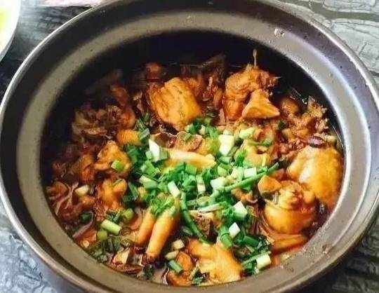 5.將醃料倒入砂鍋(醃制用的小蔥不要),加入適量的水和剩餘的半袋料酒,大概剛好滿過雞肉的位置就可以瞭。淋入兩勺大豆油;