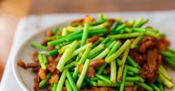 【食材】:蒜薹、肉絲、食鹽、生抽、蠔油