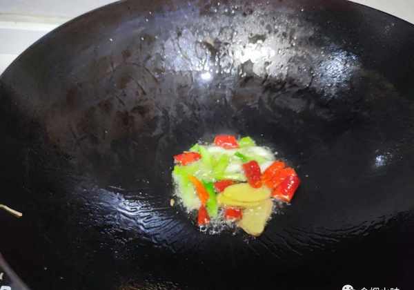 3.鍋中倒入油,將生薑,還有蔥段放入鍋裡面,用小火煸炒一下,煸炒出香味;
