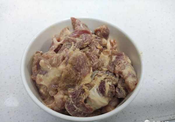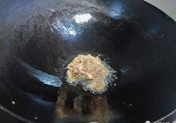 3.鍋中倒入油,將油煮熱,油熱瞭之後,我們再把醃好後的肉放入裡面。肉下鍋後用小火炒,而且鏟子要多翻動,更好地將肉炒均勻;