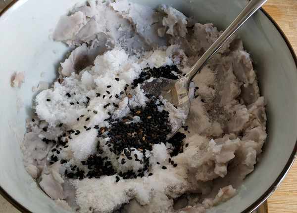 2.把蒸熟的芋頭片用勺子搗成泥狀,加白砂糖、一些糯米粉和一點黑芝麻攪拌均勻。