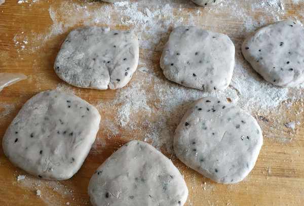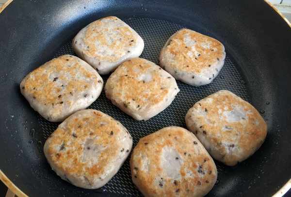 5.往平底鍋加入適量的食用油,然後放入小扁餅,小火慢慢煎香。