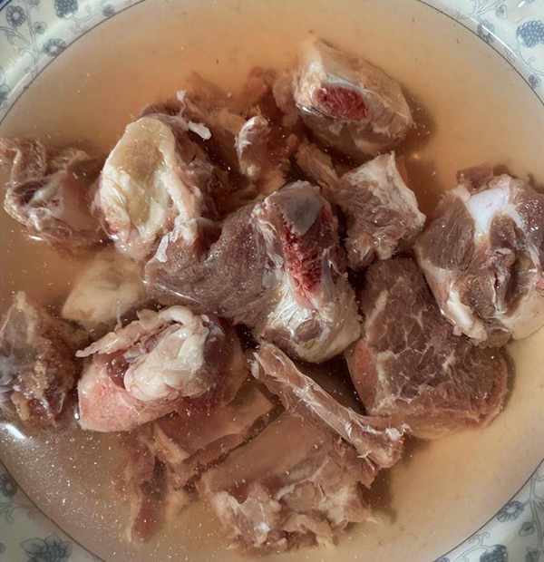 2. 排骨洗凈,放入碗中,倒入適量清水沒過排骨,將血水浸泡出來。大概10分鐘後將排骨再次洗凈。