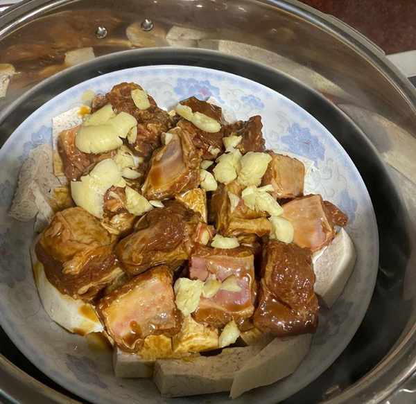 4. 將排骨鋪在芋頭上。蒜末拍碎撒在排骨表面。再將醃制的醬汁澆在盤中。
