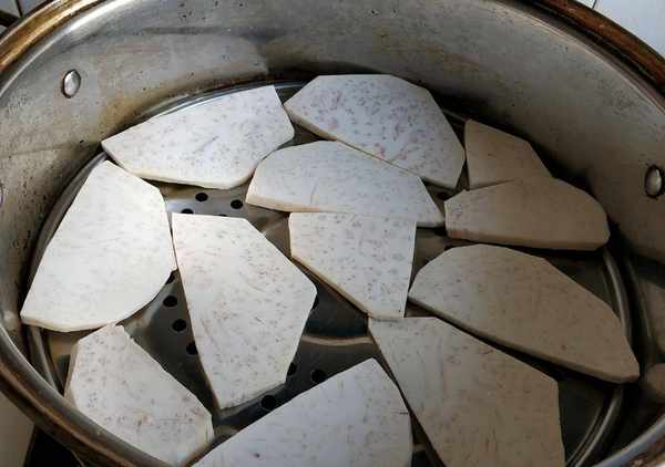 1.芋頭清洗幹凈,去皮切成薄片。我選用的是廣西荔浦芋,又粉又香。切好的芋頭片放入蒸鍋裡蒸熟透。