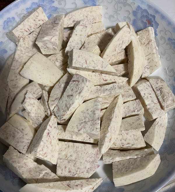 1.準備一個芋頭,去皮後洗凈,切塊後放入盤中。