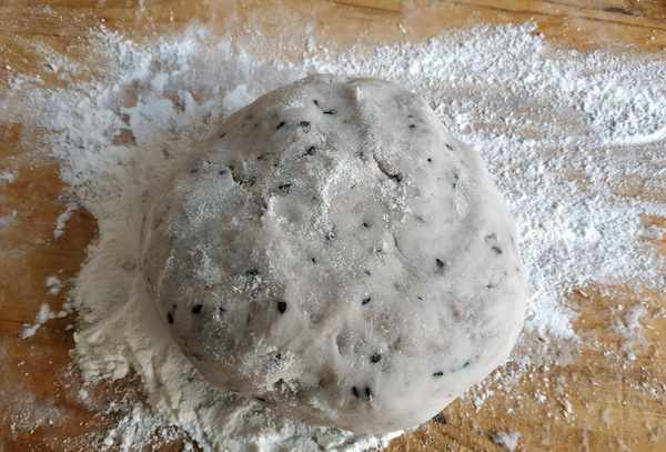 3.砧板散上一些幹面粉防粘,然後把芋頭泥揉成面團,以不粘手為宜。