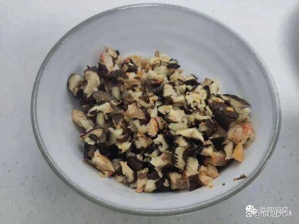 2.備好的香菇泡發,如果說著急將它泡發的話,香菇要用溫水浸泡,可以加速泡發的時間。泡好後的香菇切成丁;蝦米洗幹凈,洗凈後的蝦米給它切成小塊,切好的蝦米放到一旁備用;