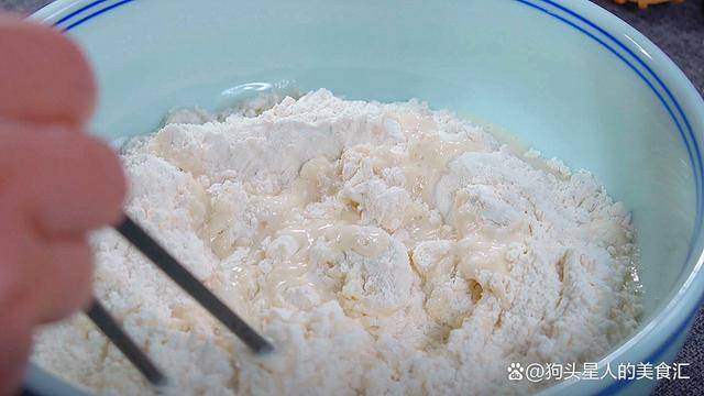 1.300克面粉放入盆中,用1180毫升熱水和面,水溫是60-70度左右,一邊倒一邊攪拌,攪拌成面絮狀。