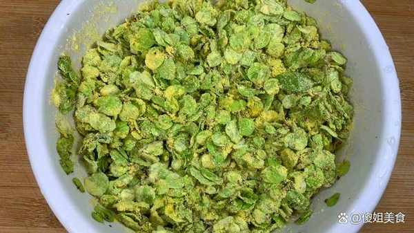 2、把榆錢放入大碗中,加少許的食用油,攪拌一下,鎖住榆錢的水分,也有利於裹住玉米面。然後再撒適量的玉米和少許的幹面粉,下手抓拌,粘裹均勻即可。