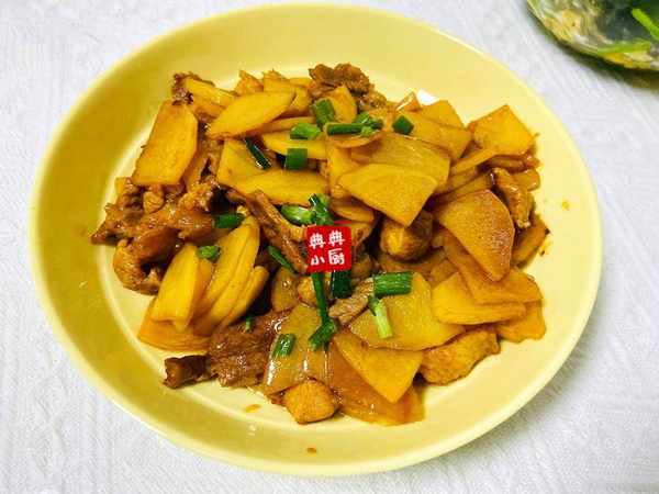 土豆切成片泡水裡,沖洗幾遍再下鍋炒。肉先炒變色,加一點生抽炒均勻之後把土豆片倒進去,翻炒至土豆片斷生,加一些蠔油,一點清水,燒至收汁就可以出鍋瞭。最後撒上一點香蔥即可。