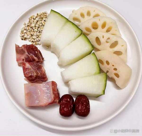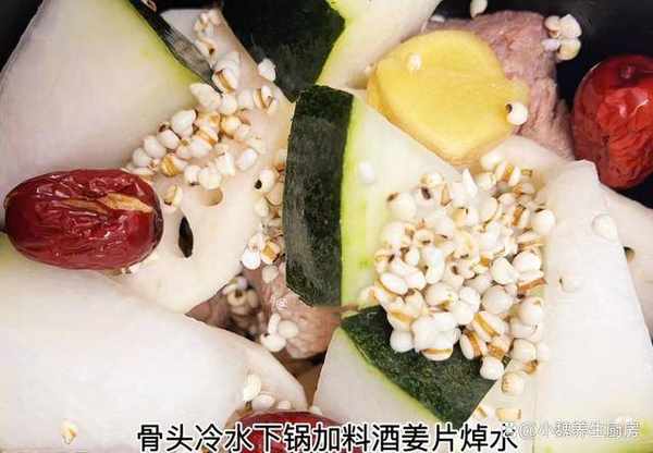 準備一些食材:選購一小把優質薏米(薏米是五谷雜糧之一,是用來祛濕的食材之一,廣東人很喜歡加它來煲湯,具有健脾祛濕,補脾益氣的作用,平常給傢裡人多囤一些,但是要幹燥儲存),適量純凈水,選購200克老冬瓜(冬瓜是一種低脂低卡的蔬菜,水分和膳食纖維很高,非常適合來燉湯,可以幫助刮油排毒,利水消腫,對身體有許多好處),蓮藕兩節,少許冷水,幾個大紅棗,選購半斤豬骨或排骨,適量白酒或料酒,適量食鹽,溫水少許,生薑15克,胡椒粉半勺,其他。