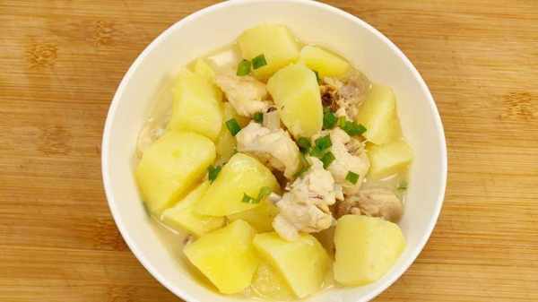 2、鍋中加入清水放入雞腿,加入蔥段、薑片倒入適量的料酒去腥,大火水開後用勺子撇去浮沫,然後撈出來放入溫水中清洗幹凈控幹水份。土豆洗凈去皮放到案板上切成小塊,放入盆中加入清水洗去淀粉。