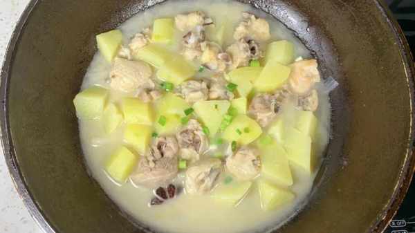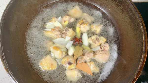 3、鍋中加入食用油,油熱後放入蒜片,先炒出香味然後在放入雞腿。倒入少許的生抽、料酒和少許老抽,翻炒幾下後加入足量的熱水,再放入少許的鹽和味精,加入幾粒大料、蔥段和薑片。大火煮開轉中小火燉制15分鐘,然後倒入土豆塊攪拌均勻,再繼續燉制10分鐘就差不多瞭。