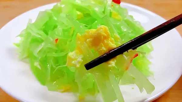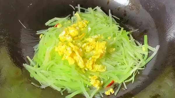3、鍋中加入少許油,油熱放入蒜片炒出香味,然後放入萵筍絲用鏟子快速的翻炒,加入適量的生抽、蠔油翻炒均勻倒入雞蛋塊,加入少許的鹽和味精,翻炒幾下就可以出鍋瞭。這道菜不需要炒制過長的時間,不然萵筍絲就會塌軟變的不清脆瞭。