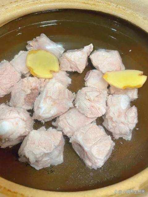 第五步:準備好一個砂鍋,鍋中放入春筍,排骨塊和薑片,加上適量純凈水,蓋上鍋蓋大火燜煮,中途可以舀掉一層浮沫。