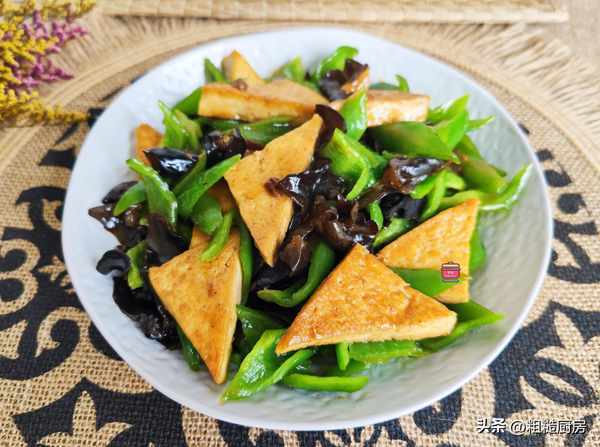 1、 老豆腐切成薄片再改刀成三角形,木耳用水分泡發撕成小朵,青椒去籽切塊備用。