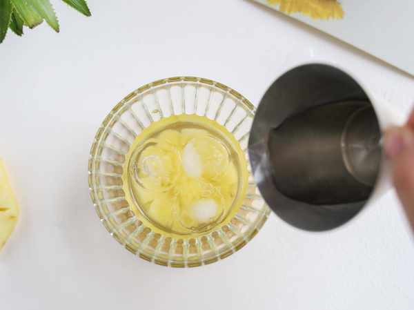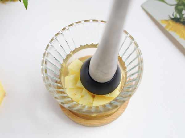 2.在杯中加入適量菠蘿,並用搗棒搗出汁,不用打得很碎,有點顆粒狀口感更好