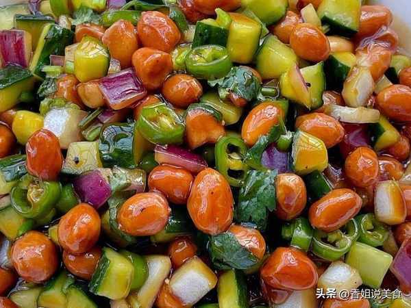 3、花生米炸熟放入碗中,黃瓜清洗幹凈後切成丁,也放進來。再放入煮好的醬汁,放入洋蔥丁、青線椒、香菜,抓拌均勻即可上桌開吃。