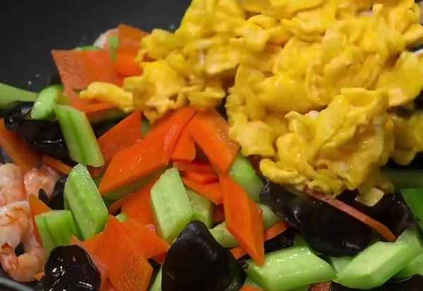 起鍋燒油,油熱下入調好的雞蛋液,炒熟後撈出備用,再下入剛才準備好的蝦頭,小火炒至變色後撈出蝦頭,再下入蔥花,蒜末,炒出香味後,下入醃制好的蝦仁,開中火炒至完全變色,再倒入胡蘿卜,木耳,黃瓜,雞蛋,再加少許鹽,1勺雞精,適量胡椒粉,半碗水淀粉,大火翻炒均勻後即可。