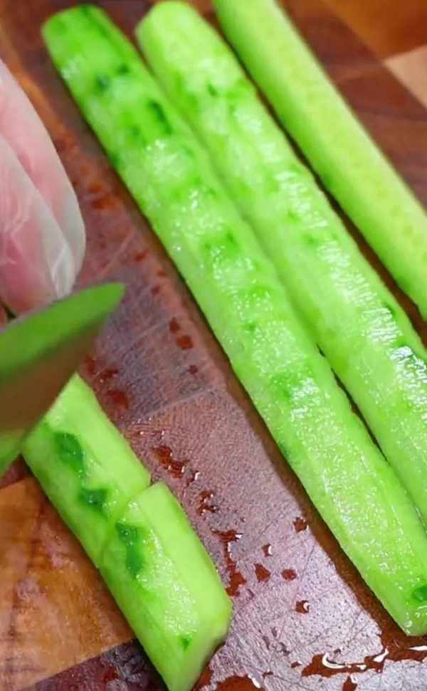 接下來處理配菜,黃瓜一分為四,去瓤,再改刀切成斜段兒。