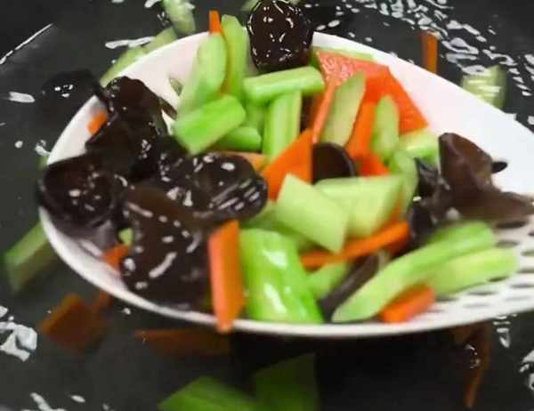 鍋中燒一鍋清水,水開後下入切好的胡蘿卜,木耳,黃瓜,焯至斷生撈出。