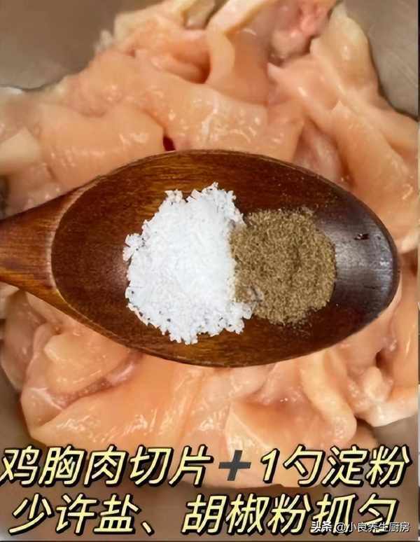 步驟2:雞胸肉用流水反復洗凈,一定記得要順紋切片,雞胸肉片放在碗中,加上食鹽半勺,加上半勺胡椒粉,還可以裹上淀粉,抓拌均勻。