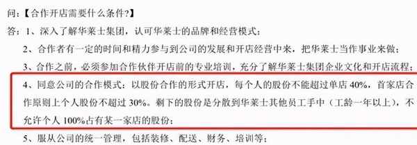在各路壓力下,華氏兄弟決定導入律師事務所的合夥人機制,將對門店有價值貢獻的相關人員,以合夥制的方式與門店綁定,如隻有公司總部員工(前員工)、每個單店員工、有店鋪資源的人、老板及公司有業務來往的熟人,才有資格申請合夥,同時不允許個人100%占股,在找到門店後由總部與出資人共同出資,總部占股60%,並將其中的5%拿出來分給其他員工。