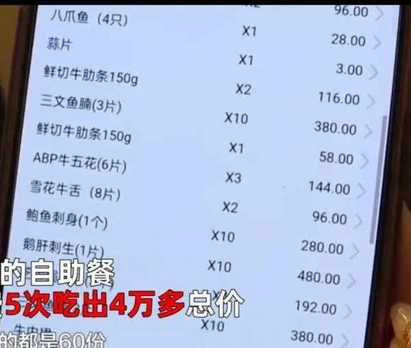 4月15日,貴州貴陽,一頓218元的自助餐,女子月消費5次吃出4萬多的總價,引發熱議。