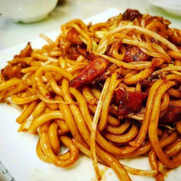 4 油鍋下雞肉翻炒至五成熟,再下菜粒和胡蘿卜絲翻炒至八成熟,下烏冬一起炒,並開始加鹽,黑椒,生抽調味,還可以加一點白糖吊味;最後加入蛋絲翻炒均勻即可上碟食用。
