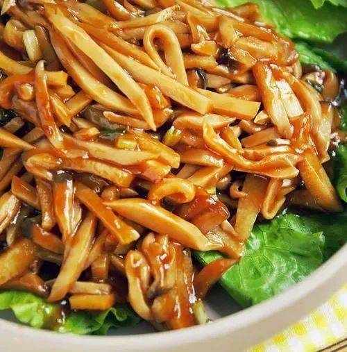 6 隨後倒入平菇絲中小火慢慢煸炒。